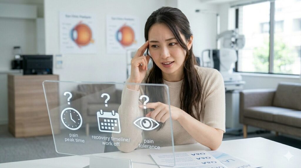 ラセックの痛みの強さ・ピーク・回復までの流れを時系列でわかりやすく解説します。あわせて、痛みの原因や和らげる方法、レーシックやSMILEとの違い、ラセックが向いている人の特徴までまとめています。
