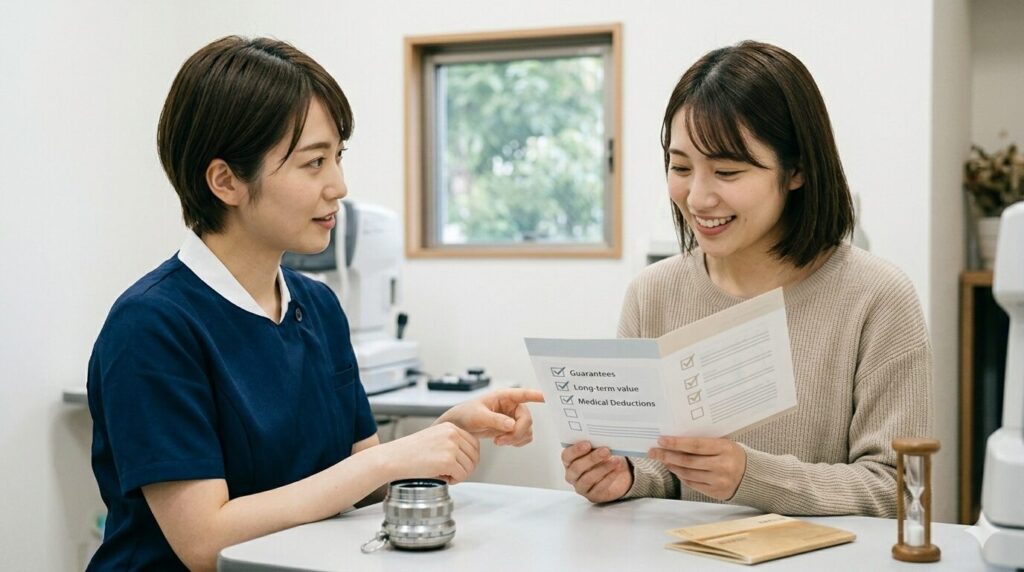 費用のことで後悔しないために、カウンセリングでは「追加費用の有無」と「保証の条件」を徹底的に質問してください。 視能訓練士やカウンセラーに対して、具体的な数字や期限を確認することで、後からの「こんなはずじゃなかった」を防ぐことができます。